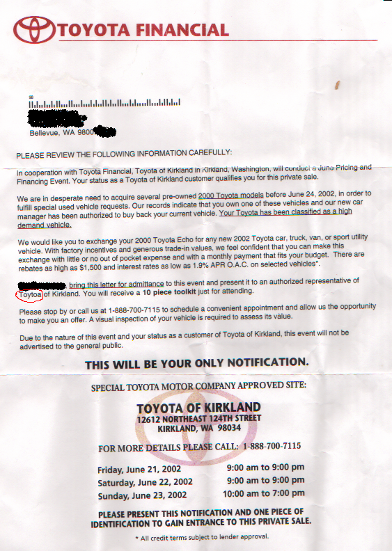 we're desparate!I've been happily driving my Toyota Echo ever since I bought it, and it now, as of mid-June, 2002, has nearly 40,000 miles on it. The car has never given me any trouble, so I never even considered replacing it before I received the following official-looking letter: PLEASE REVIEW THE FOLLOWING INFORMATION CAREFULLY: In cooperation with Toyota Financial, Toyota of Kirkland in Kirkland, Washington, will conduct a June Pricing and Financing Event. Your status as a Toyota of Kirkland customer qualifies you for this private sale. We are in desperate need to acquire several pre-owned 2000 Toyota models before June 24, 2002, in order to fulfill special used vehicle requests. Our records indicate that you own one of these vehicles and our new car manager has been authorized to buy back your current vehicle. Your Toyota has been classified as a high demand vehicle. We would like you to exchange your 2000 Toyota Echo for any new 2002 Toyota car, truck, van or sport utility vehicle. With factory incentives and generous trade-in values, we feel confident that you can make this exchange with little or no out of pocket expense and with a monthly payment that fits your budget. There are rebates as high as $1,500 and interest rates as low as 1.9% APR O.A.C. on selected vehicles*. [My name], bring this letter for admittance to this event and present it to an authorized representative of Toytoa of Kirkland. You will receive a 10 piece toolkit just for attending. Please stop by or call us at 1-888-700-7115 to schedule a convenient appointment and allow us the opportunity tomake you an offer. A visual inspection of your vehicle is required to assess its value. Due to the nature of this event and your status as a customer of Toyota of Kirkland, this event will not be advertised to the general public. THIS WILL BE YOUR ONLY NOTIFICATION.SPECIAL TOYOTA MOTOR COMPANY APPROVED SITE:TOYOTA OF KIRKLAND FOR MORE DETAILS PLEASE CALL: 1-888-700-7115Friday, June 21, 2002 9:00 am to 9:00 pm Saturday, June 22, 2002 9:00 am to 9:00 pm Sunday, June 23, 2002 10:00 am to 7:00 pm PLEASE PRESENT THIS NOTIFICATION AND ONE PIECE OF IDENTIFICATION TO GAIN ENTRANCE TO THIS PRIVATE SALE. * All credit terms subject to lender approval. page 1 of 2 |